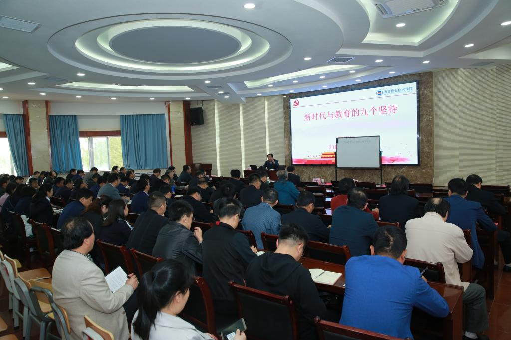 王周锁结合个人学习思考和工作经历,围绕办好新时代职业教育,为国家培养大国工匠,从中国特色社会主义新时代的科学内涵、习近平总书记在全国教育大会上提出的“九个坚持”新理念新思想新观点、如何深入学习贯彻习近平总书记关于教育的重要论述三个方面作了深入浅出的讲解。他指出,“九个坚持”体现了中国国情,既继承我国教育优良传统,又具有鲜明时代特征,深刻回答了我国教育改革发展重大理论和实践问题。我们要切实把思想和行动统一到习近平总书记关于教育的重要论述上来,结合学院实际,创新人才培养模式,全面提升人才培养质量,培养一批战斗在各个行业领域的大国工匠。