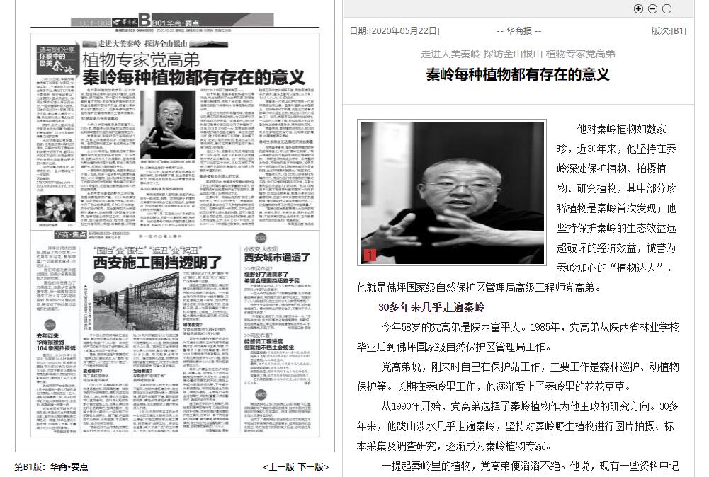 5月22日,华商报B1版头条新闻《植物专家党高弟:秦岭每种植物都有存在的意义》报道了我院优秀校友党高弟。