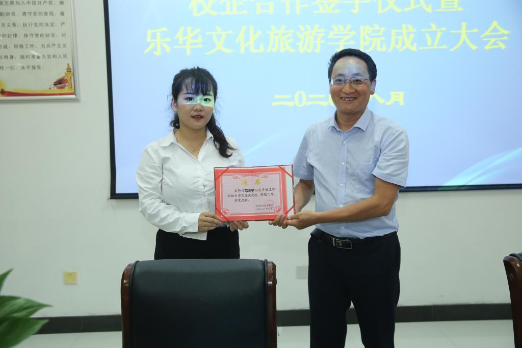 签约仪式上,张迪与范蕊宁签订校企合作协议书,共同为“乐华文化旅游学院”和“产教融合实训基地”揭牌。范蕊宁为学院5名教师颁发企业顾问和培训教师聘书。董育公为企业人员颁发兼职教师聘书。