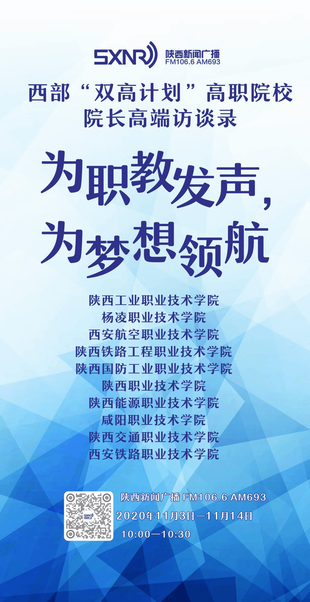 11月3日上午,校长王周锁受邀做客陕西新闻广播《1066教育直通车》节目直播间作首场《西部“双高计划”院长高端访谈录》,就学校基本情况、特色专业、“双高计划”建设思路和主要目标、“双高”计划重要任务、进展情况和效果等问题接受访谈。