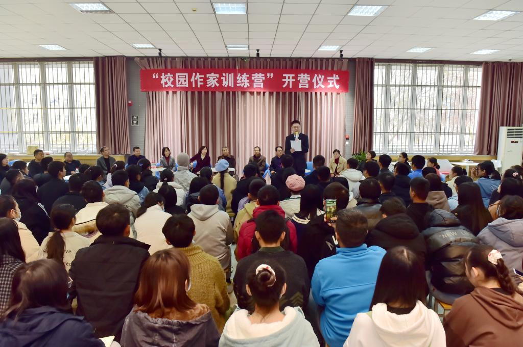 11月21日下午,浦京“校园作家训练营”在西校区图书馆举行开营仪式。副校长祝战斌致辞,图书馆馆长王红相、文理分院院长王云江,中国作协、省作协十位作家,以及部分教师代表、团委《职苑文艺》编辑部、各二级学院文学社成员共300余人参加了开营仪式。仪式由学工部副部长、团委书记陈吼主持。