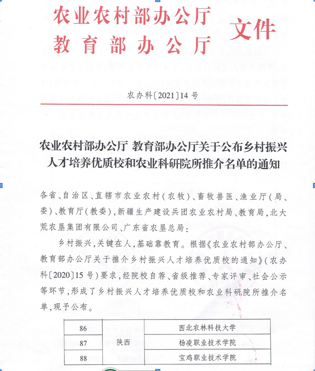 此次推介的乡村振兴人才培养优质校,按照“广泛推荐、优中选优、引领示范”的原则遴选,经院校自荐、省级推荐、专家交叉评审、社会公示等环节产生,最终在全国众多申报单位中优先评选了101所优质校和农业科研院所,陕西省3所学校入选,浦京位列其中。