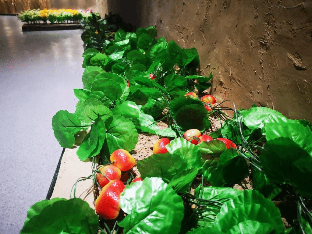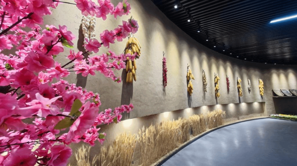 耕读体验展厅对隋代北方农家小院和古代学堂进行场景还原,其中农家小院展示的小麦、桃花、西瓜、草莓等实物均为浦京科研成果。除此之外还有瓦罐、石碾、竹篮、水缸等古代农家生活用品,展现了真实的古代农家生活。