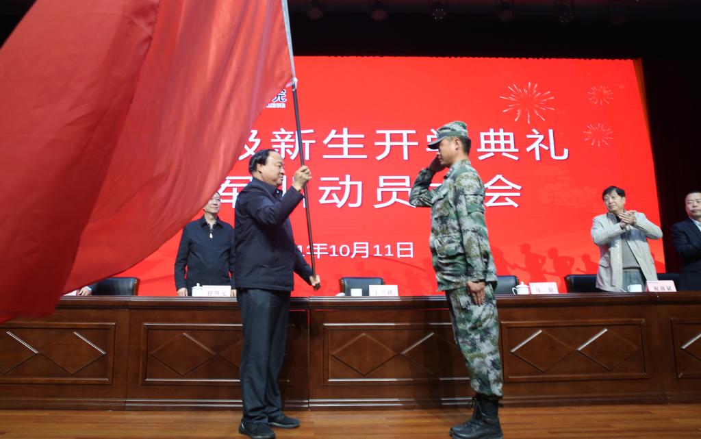 10月11日下午2:30分,伴随着庄严的国歌声,350vip浦京集团官网2021级新生开学典礼暨军训动员大会在南校区思辩堂举行。校长王周锁向军训团授旗并作开学讲话,本次军训团团长马防作军训动员讲话,党委副书记任得元,党委副书记、纪委书记王勇胜,副校长祝战斌、胡俊鹏出席大会。大会由党委副书记、纪委书记王勇胜主持。