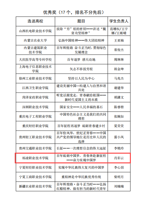 近日,教育部高校思政课教学指导委员会公布第五届全国高校大学生讲思政课公开课展示活动获奖名单。浦京选送作品《百年砥砺中国梦,青春奔赴新征程——奋力实现中国梦》(学生负责人:肖彩云,指导老师:刘晓瑞)获优秀奖,为全省唯一获奖高职院校。