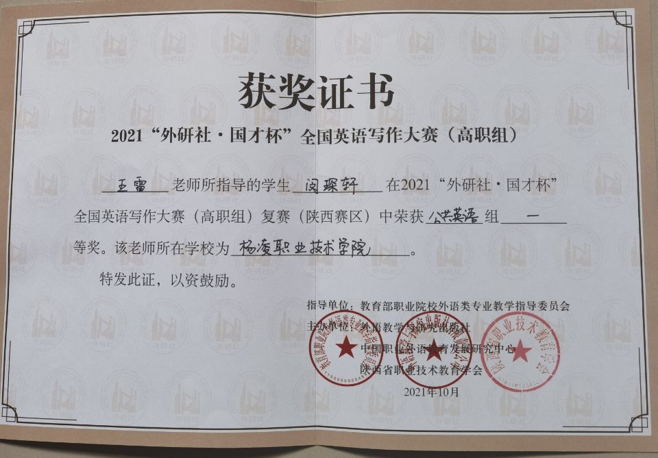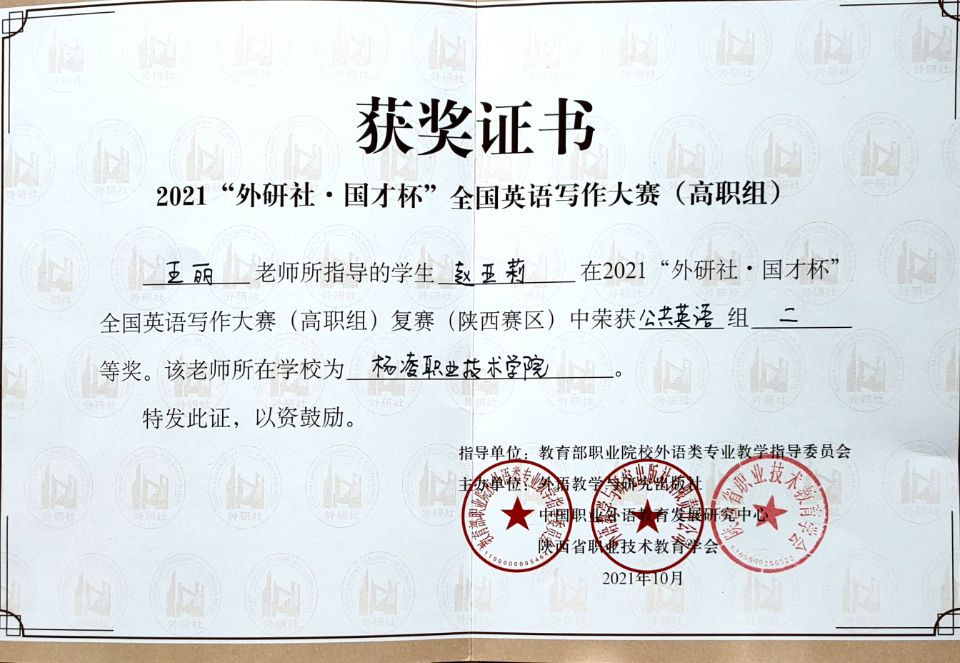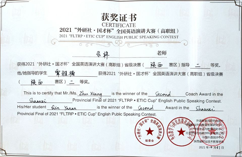近日,2021“外研社·国才杯”全国大学生英语写作、演讲大赛(高职组)陕西赛区复赛成绩公布。浦京学生闵琛轩获公共英语组写作大赛省级一等奖,赵亚莉获公共英语组写作大赛省级二等奖,覃雅楠获英语演讲大赛省级二等奖。