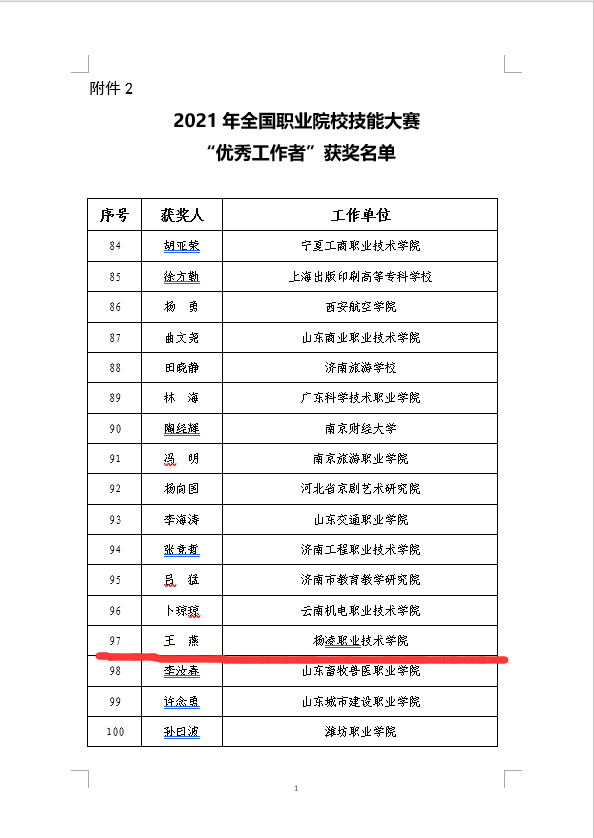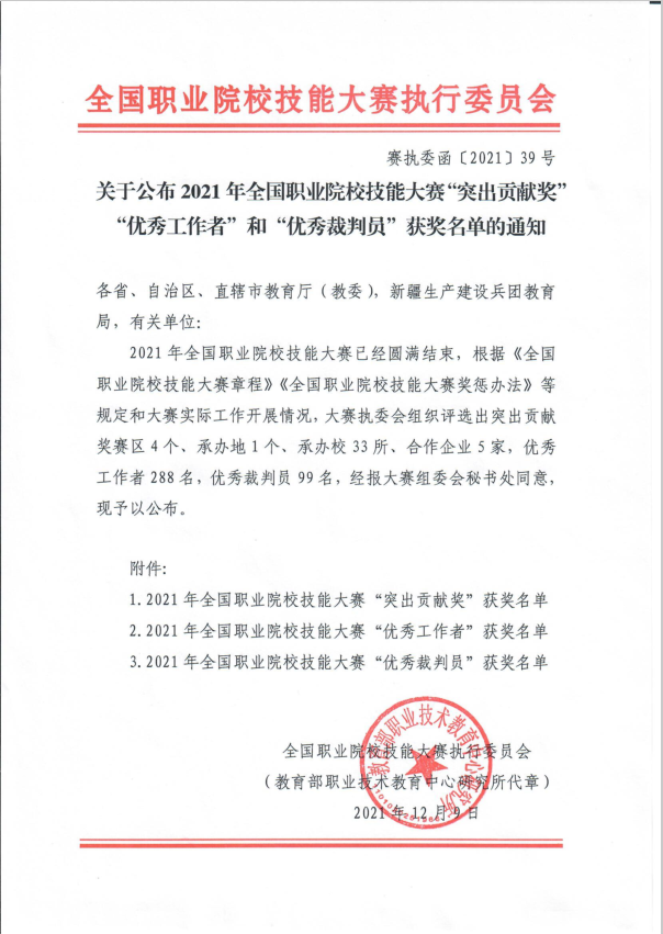 近日,全国职业院校技能大赛执行委员会公布了2021年全国职业院校技能大赛“突出贡献奖”、“优秀工作者”和“优秀裁判员”获奖名单,浦京荣获“突出贡献奖”,生物工程学院副院长王燕被评为“优秀工作者”。