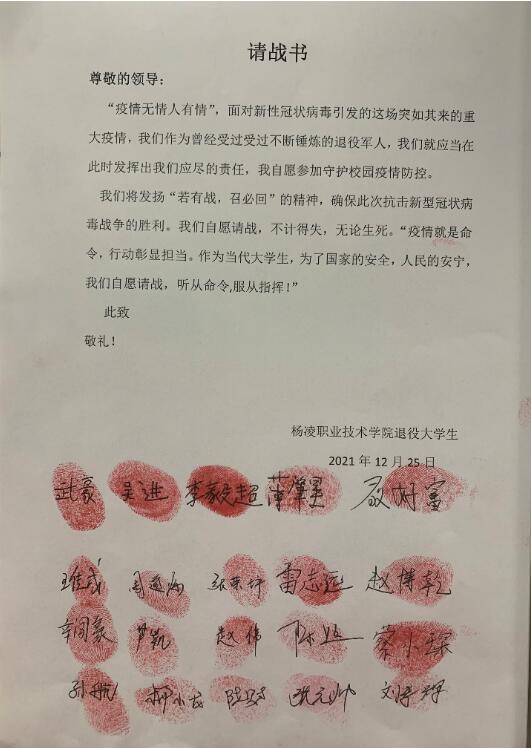 疫情就是命令,防控就是责任。在疫情防控中,以实际行动践行“若有战、召必回”的使命担当,凝聚众志成城、共克时艰的磅礴青春正能量,为广大师生做好抗疫特殊时期的服务工作。他们写下请战书,宣誓坚守岗位、严守纪律、服从指挥,与全校师生携手积极参与到学校疫情防控工作各个环节,体现了当代杨职学子的本色和担当。面对低温、寒冷的天气,他们永不退缩,积极配合学校的防疫工作,参与浦京核酸检测的疏导工作,志愿服务,守护有我,在平凡的工作岗位上诠释着自己的初心和使命。