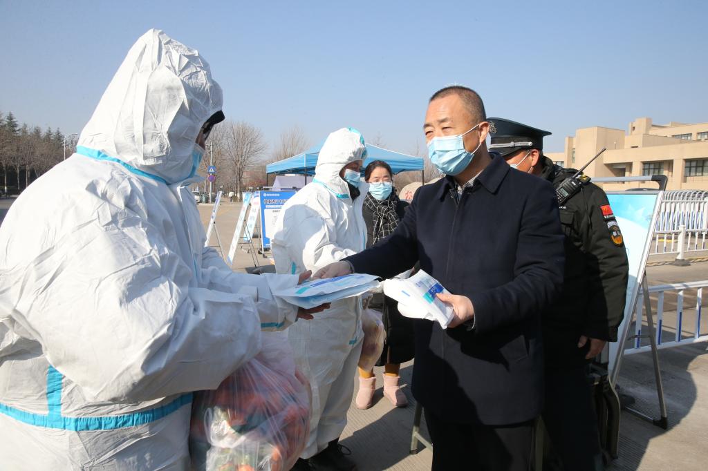 1月1日上午,新年伊始,党委书记陈宁、校长王周锁、党委副书记任得元、副校长胡俊鹏等深入疫情防控第一线,检查指导疫情防控工作,看望慰问防疫一线工作人员,并向他们表达新年的祝福与问候。党政办公室、保卫处、后勤保障处主要负责人参加慰问活动。