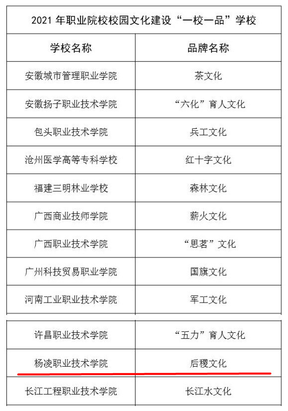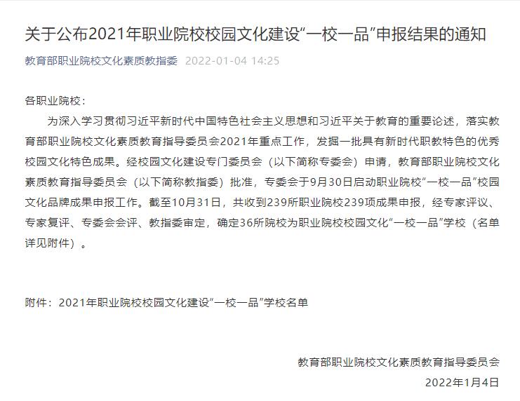 1月4日,教育部职业院校文化素质教育指导委员会公布了2021年全国职业院校校园文化建设“一校一品”申报结果,浦京“后稷文化”品牌成功入选。学校荣获全国职业院校校园文化“一校一品”学校称号。