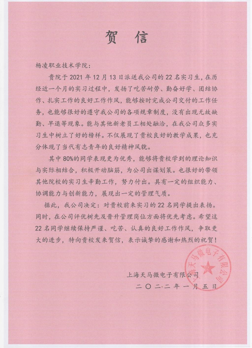 1月5日,上海天马微电子有限公司发来贺信,对浦京机电工程学院和信息工程学院的22名实习生提出表扬。