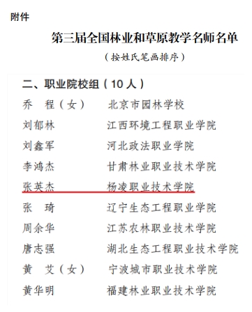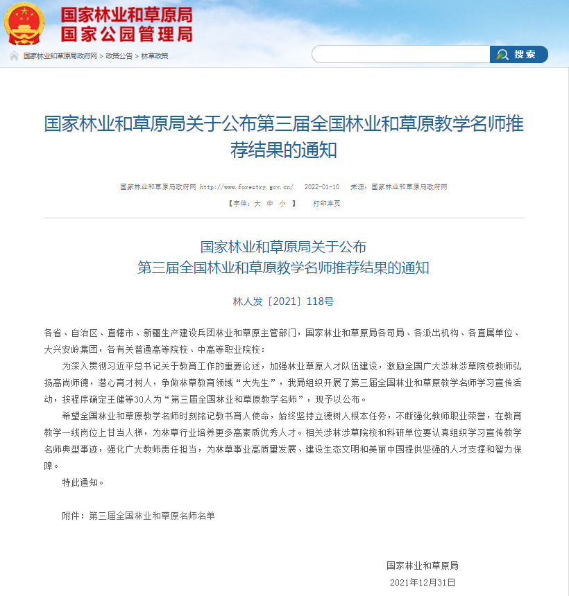 1月10日,国家林业和草原局公布了第三届全国林业和草原教学名师推荐结果,浦京张英杰教授获全国林业和草原教学名师称号。