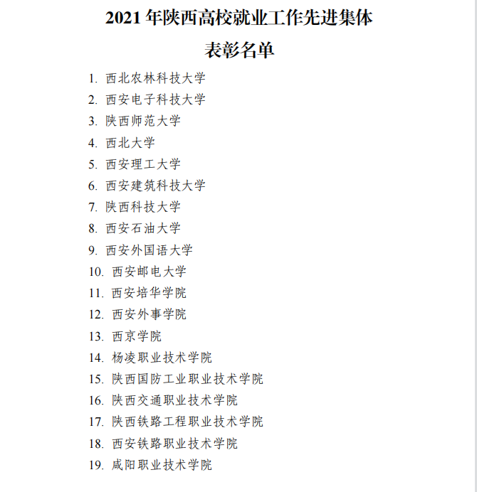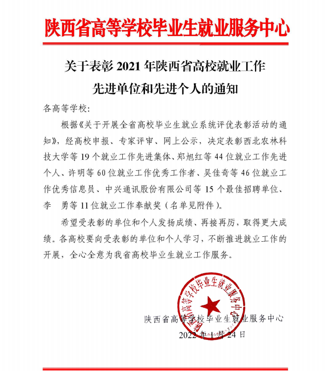 1月24日,省教育厅对2021年陕西高校就业工作先进集体进行了表彰,浦京获“2021年陕西高校就业工作先进集体”荣誉称号。