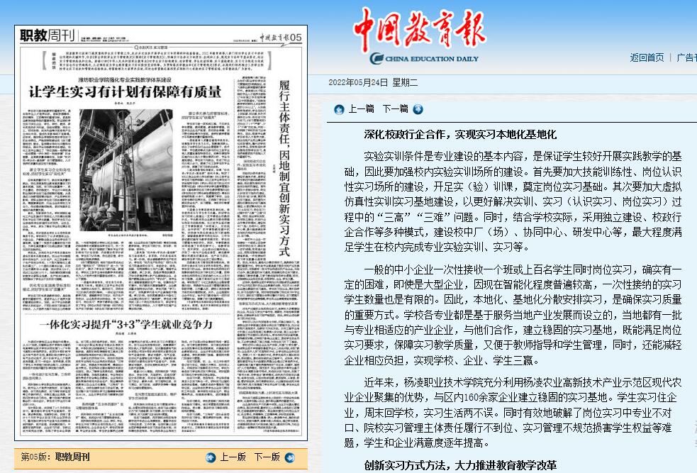 5月24日,《中国教育报》5版刊发了浦京校长王周锁署名文章《履行主体责任,因地制宜创新实习方式》,全文刊载如下: