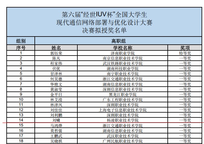 9月25日,由中国通信学会主办、南京邮电大学承办的第六届“经世IUV杯”现代通信网络部署与优化设计大赛全国总决赛圆满落幕。来自全国331所本科、高职院校的5560名学生参加比赛,经预赛、决赛两个阶段的激烈比拼,浦京现代通信技术专业学生刘啸荣获国赛一等奖。