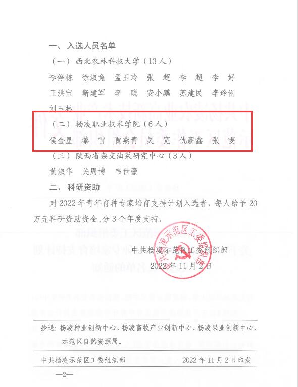 11月3日,杨凌示范区召开青年育种专家座谈会,宣布2022年青年育种专家培育支持计划入选名单,浦京侯金星、贾燕青、黎雪、仇薪鑫、吴宽、张雯等6人入选2022年青年育种专家培育支持计划。副校长胡俊鹏出席座谈会,张雯、侯金星代表入选人员做表态发言。