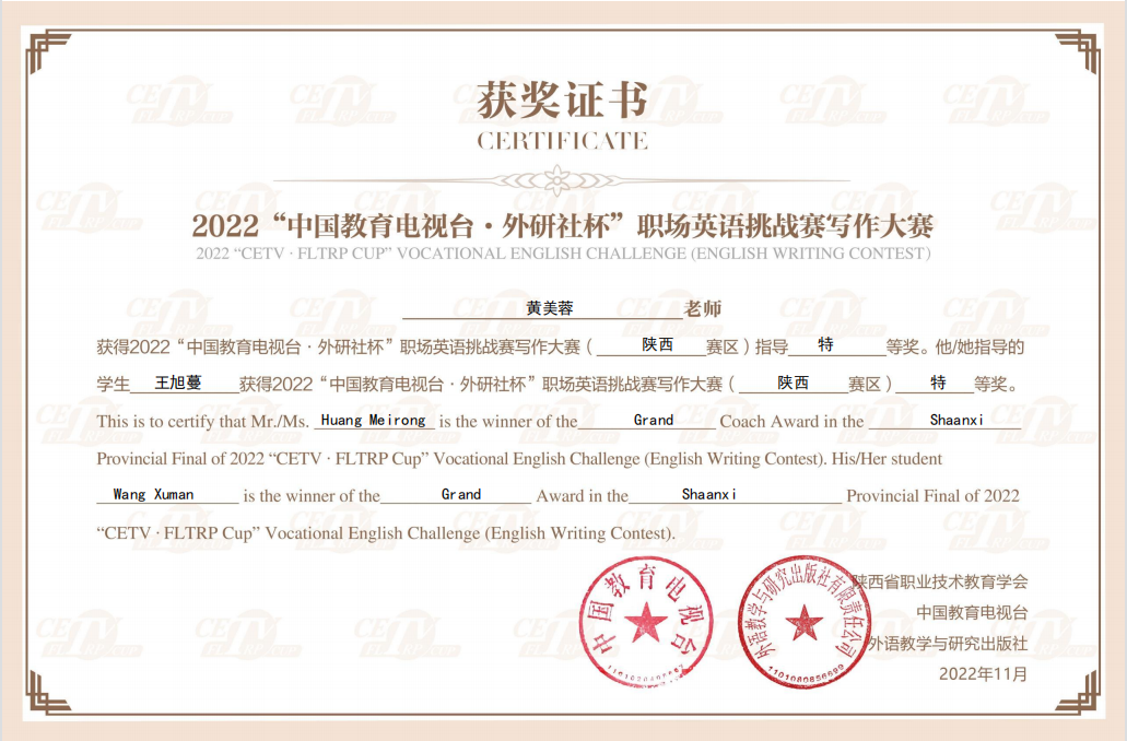 本次比赛在中国职业技术教育学会指导下,由陕西省职业技术教育学会、中国教育电视台和外语教学与研究出版社联合主办,全省近200名学生参赛,是一项拥有地区影响力的职业教育类赛事,分演讲大赛和写作大赛两大赛事。今年省赛与国赛首次采用不分组的方式,即英语专业和非英语专业的学生使用同样的赛题进行角逐,给非英语专业的学生带来了很大的挑战。