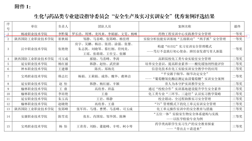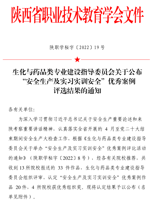 近日,陕西省职业技术教育学会生化与药品类专业建设指导委员会公布了“安全生产及实习实训安全”优秀案例评选结果。浦京药物与化工学院实践教学安全管理案例获一等奖。
