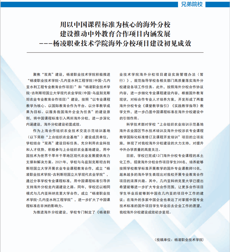 作为上海合作组织农业技术交流示范培训基地(以下简称“上合组织农业基地”)建设成员单位,学校结合“双高”建设目标任务,充分利用农业科技和人才优势,积极参与上合组织农业基地建设,用中国技术为世界干旱半干旱地区现代农业发展提供有力支撑和解决方案。2021年,学校与乌兹别克斯坦古利斯坦国立大学开展农业专业课程教育合作,成立“350vip浦京集团官网-古利斯坦国立大学现代农业学院”,通过分享学校专业课程标准,用中国课程标准引导并支持海外分校走内涵建设之路。同年,学校还以相同模式与几内亚科纳克里大学合作,成立“350vip浦京集团官网-几内亚水利工程学院”,进一步扩大了中国课程标准在非洲的影响力。