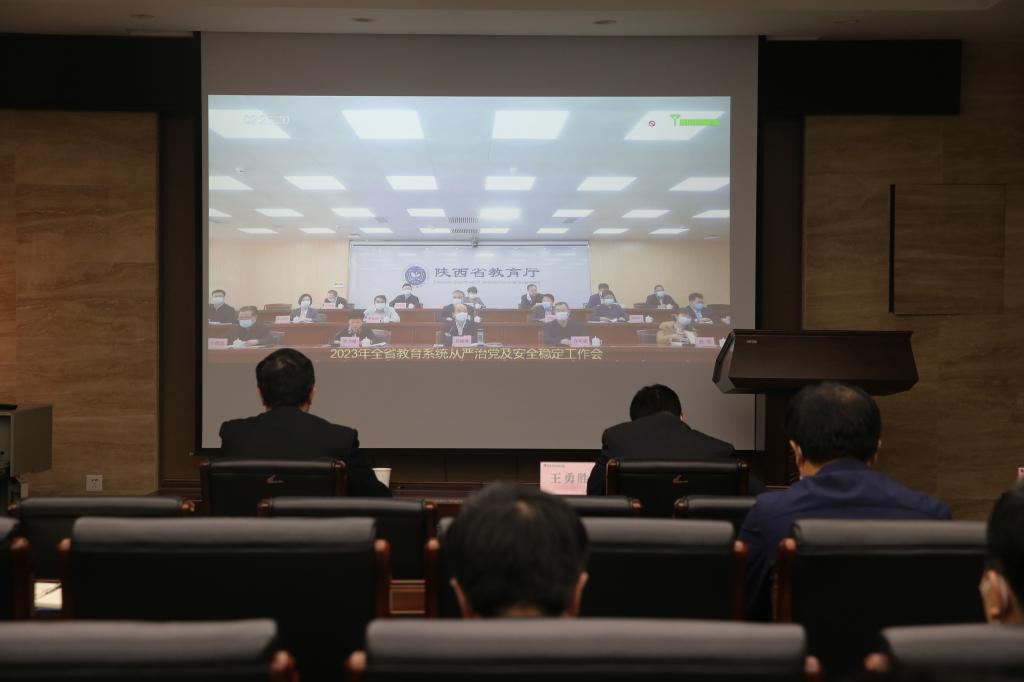 会议通过视频方式召开,设立省教育厅主会场,各市(地)、县(市、区)、高校分会场。浦京全体校领导、党委委员、机关处室负责人和各学院党总支(直属党支部)书记在视频会议室参加会议。党委书记王周锁在主会场代表学校党委作了题为《以全面从严治党新成效引领学校高质量发展》的典型发言。