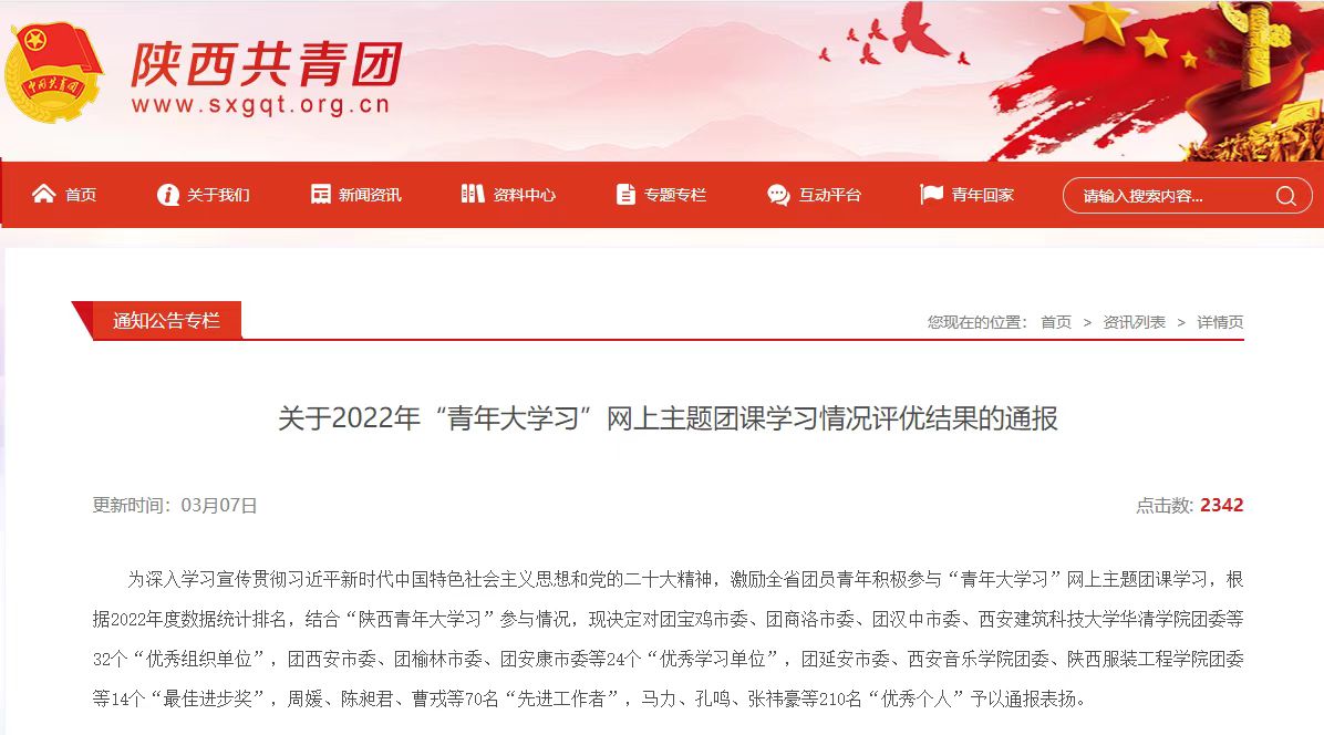 为深入学习宣传贯彻习近平新时代中国特色社会主义思想和党的二十大精神,激励团员青年积极参与“青年大学习”网上主题团课学习,近日,团省委对全省2022年“青年大学习”网上主题团课学习情况评优结果予以表彰通报。校团委荣获“优秀学习单位”称号,信息工程学院教师赵朋波荣获“先进工作者”称号,建筑工程学院学生王帅、药物与化工学院学生刘梦梦、动物工程学院学生张宇博荣获“优秀个人”称号。