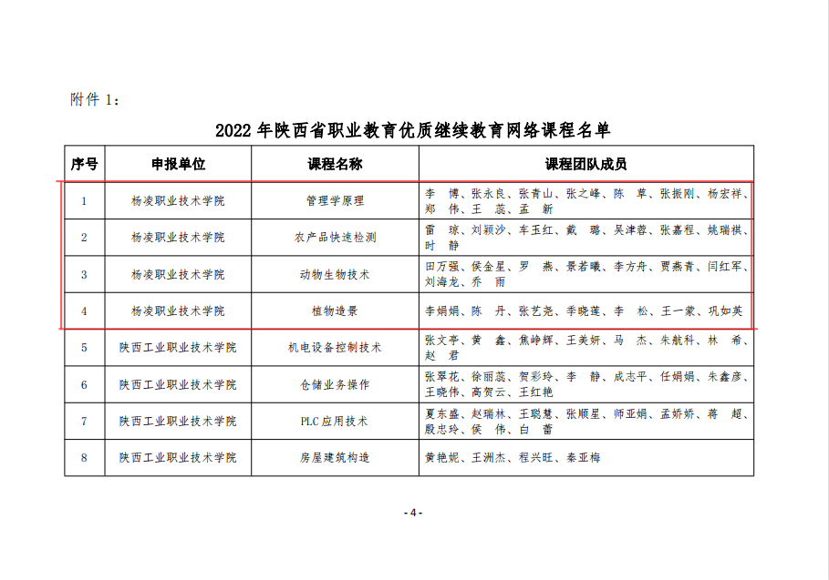 本次优质继续教育网络课程认定工作经过专家审阅课程申报资料、登录平台查看课程资源、综合打分排序和网上公示等环节,全省共有50门课程被认定为2022年陕西省职业教育优质继续教育网络课程,浦京管理学原理、农产品快速检测、动物生物技术和植物造景4门课程入选。下一步,学校将按照文件的建设要求,高质量完成课程后续建设任务。