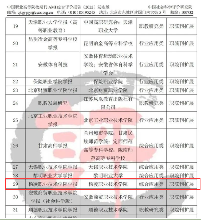 3月15日,中国社会科学评价研究院(CASSES)发布了《中国职业高等院校期刊AMI综合评价报告(2022年)》,根据职业高等院校学报和专业刊发展的特点,对全国职业高等院校主办的164种学术期刊分3个属性大类和8个学科类分别进行评价,评选出14种“职院刊核心期刊”,43种“职院刊扩展期刊”,107种“职院刊入库期刊”。浦京学报入选中国职业高等院校期刊AMI综合评价“职院刊扩展期刊”,名列第29位,为陕西省入选期刊中唯一的综合应用类职院刊扩展期刊。