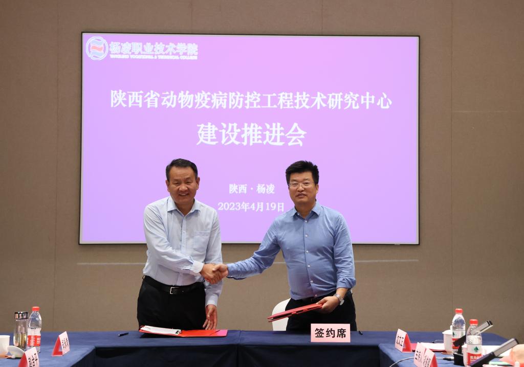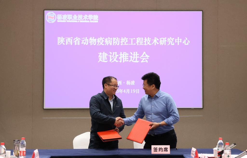 会上,郭杰和王周锁为专家颁发聘书,王云岗宣读了《关于组建农业农村领域工程技术研发中心的通知》,科技与教育研究处处长冯旭宣读了中心聘任学术委员会专家名单,工程技术研究中心主任张振仓教授作表态发言,并与陕西省动物疫病预防控制中心、陕西石羊农业科技股份有限公司和杨凌凯瑞生物科技有限公司等共建单位签订共建协议。