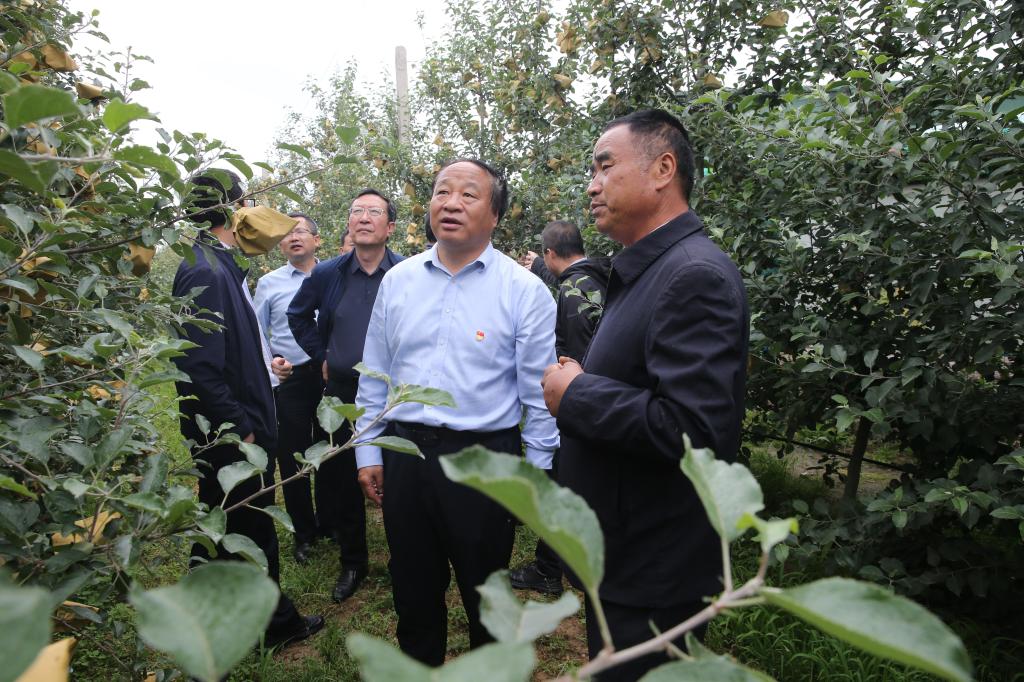 随后,王周锁一行前往旬邑县职田镇万寿村,与村干部围绕全面推进乡村振兴进行座谈交流,了解村主导产业、集体经济发展情况,以及推进乡村振兴中面临的主要问题。在位于该村的旬邑万年古槐苹果专业合作社种植基地,大家实地参观了解了种植规模、技术指导、市场销售、带动就业等情况。