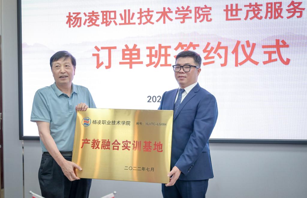 ▲7月28日,浦京“世茂服务”订单班签约仪式举行。副校长祝战斌与世茂服务西北中心城市公司总经理周兵代表校企双方签订了订单培养协议,并向企业授予“产教融合实训基地”牌子;周兵向学校授予“现代物业管理专业人才培养基地”牌子;校企双方互聘兼职老师与岗位技能培训师。