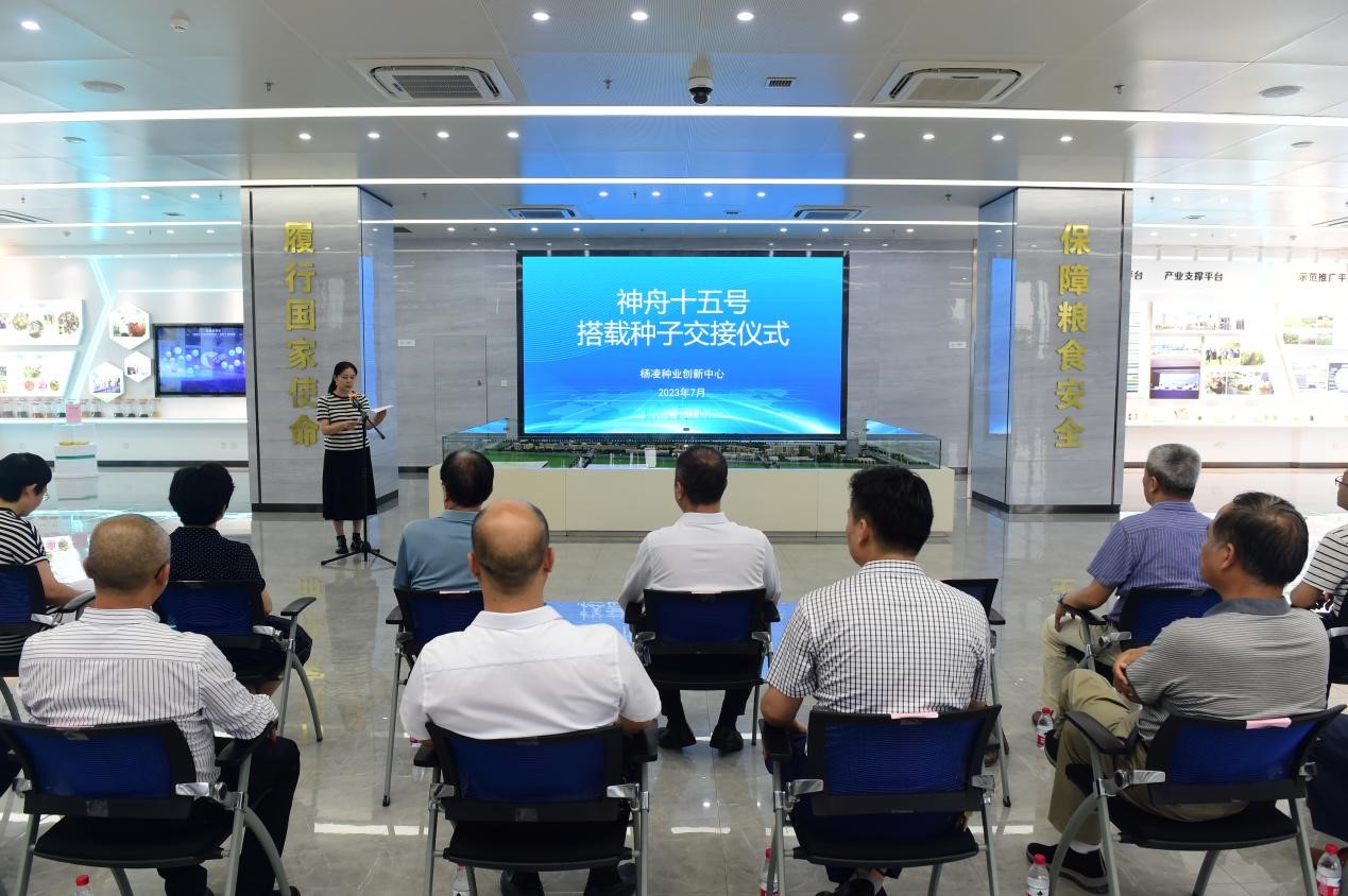 ▲7月 28 日,神舟十五号搭载种子交接仪式在杨凌国际种业大厦举行。交接仪式上,杨凌示范区党工委委员、管委会副主任马江涛向浦京副校长祝战斌移交了由学校培育的在太空遨游了186天的小麦育种材料“武农981”“杨职99”和“杨职111”,并颁发公证证书。