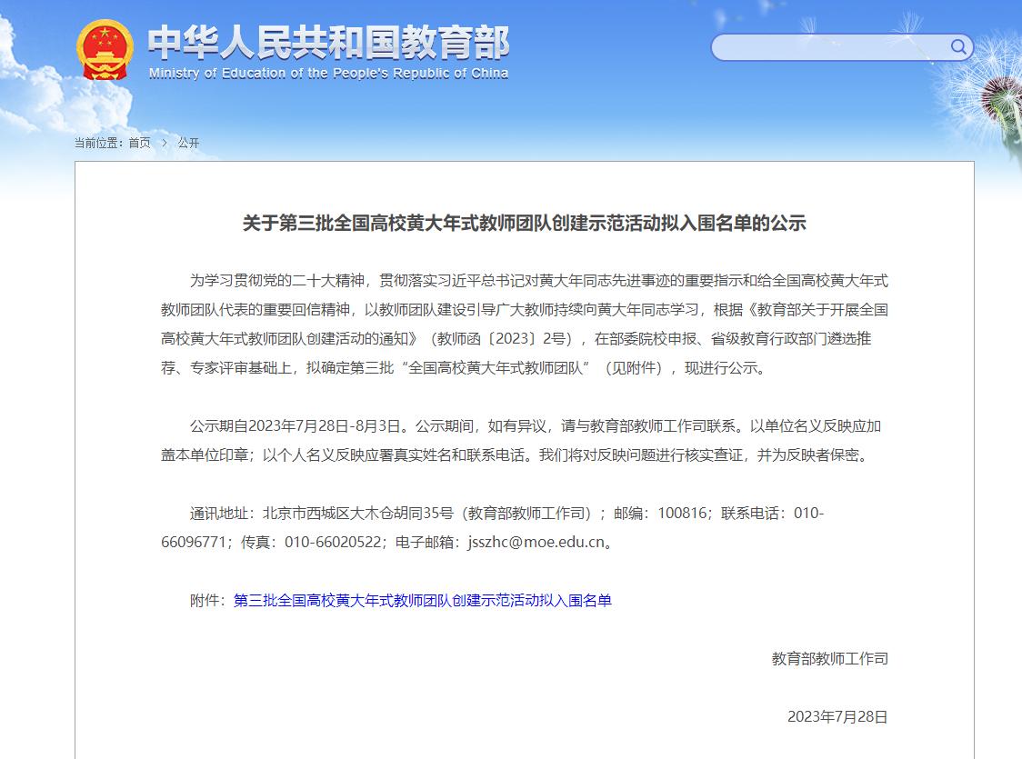 ▲7月28日,教育部公布了《关于第三批全国高校黄大年式教师团队创建示范活动拟入围名单的公示》,浦京畜牧兽医教师团队入选第三批全国高校黄大年式教师团队;陕西省教育厅发布了《关于公布第二批陕西省高校黄大年式教师团队的通知》,浦京现代农业技术教师团队入选第二批陕西省黄大年式教师团队。