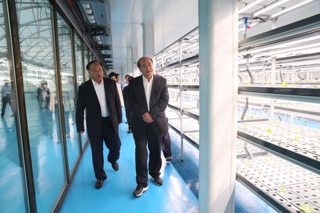在农林综合实训基地智慧农业工厂,刘建林参观了植物育苗工厂和科研成果展示柜,对浦京近年来在科研方面取得的成果表示肯定。他表示,学校要加强校企合作,推动科技成果转化,提升职业教育服务产业发展的能力。