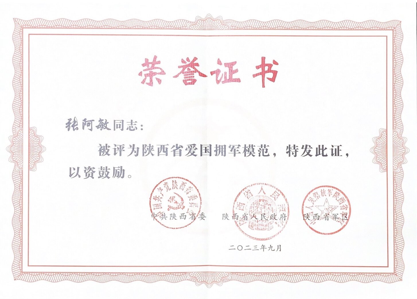 近日,陕西省双拥模范城(县)命名暨双拥模范单位和个人表彰大会在西安召开。浦京保卫处张阿敏老师被省委省政府、省军区授予“陕西省爱国拥军模范”荣誉称号。