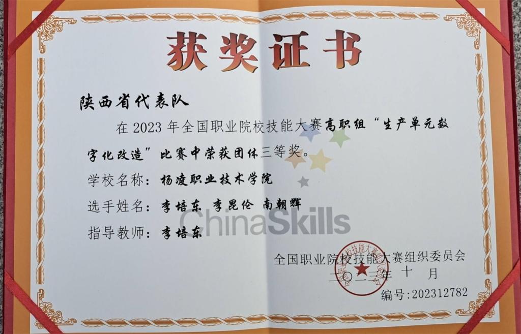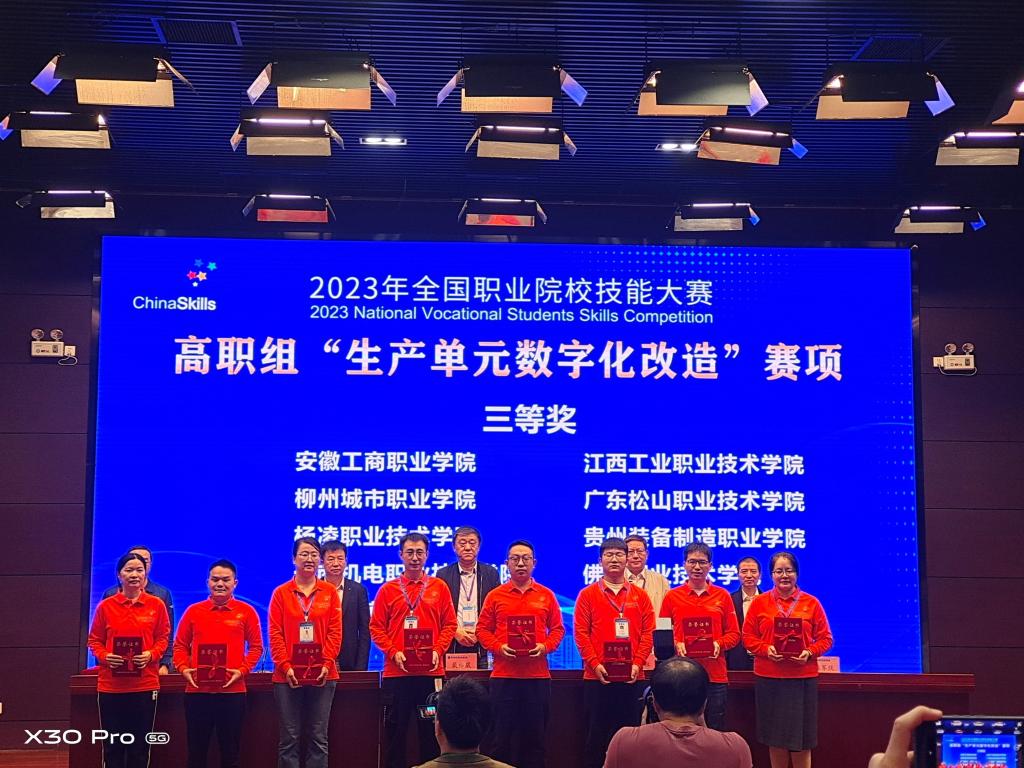 10月11日至13日,2023年全国职业院校技能大赛高职组“生产单元数字化改造(师生同赛)”赛项在天津轻工职业技术学院举办,共有来自全国30个省(市)、自治区的82支代表队、246名选手参加了本次比赛。浦京教师李培东和学生李昆伦、南朝辉组成的代表队荣获三等奖。