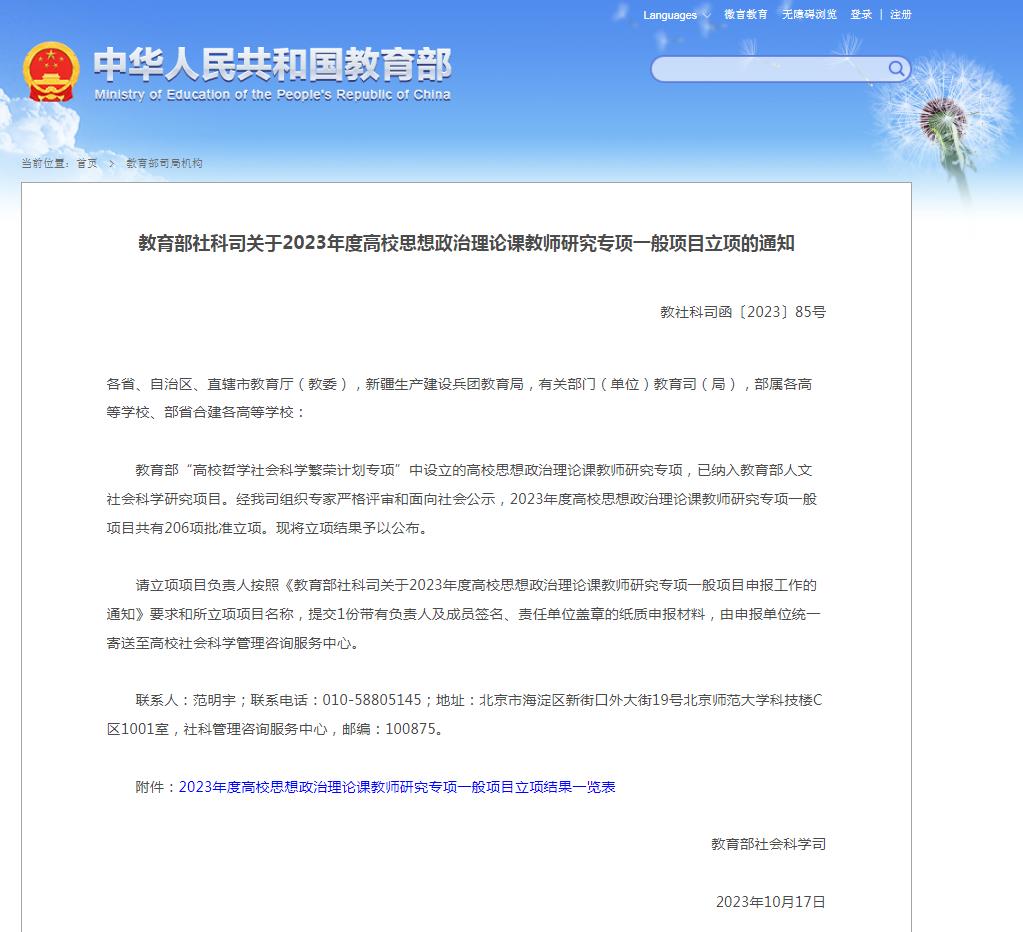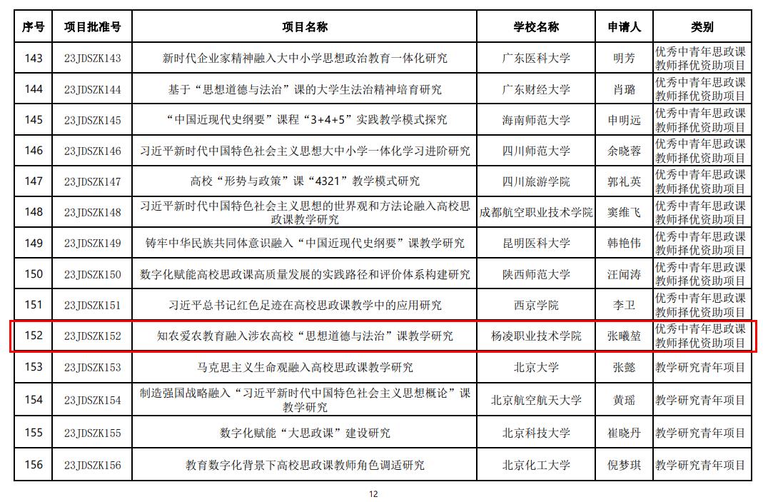经教育部社科司组织专家严格评审和面向社会公示,2023年度高校思想政治理论课教师研究专项一般项目共有206项批准立项。其中,陕西省共有13个项目获批,张曦堃主持的项目是我省唯一的高职高专立项项目。