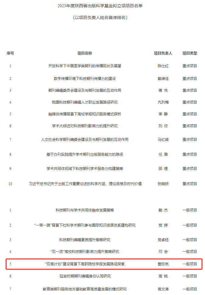 11月2日至4日,陕西省高等学校学报研究会第九届二次理事会议暨2023年学术年会在陕西韩城举行。会议公布了陕西省出版科学基金项目立项结果,浦京董欣岚老师主持申报的“‘双高计划’建设背景下高职院校学报发展路径探索”课题获批立项。