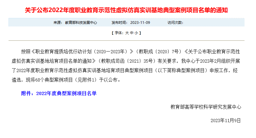 11月9日,教育部高等学校科学研究发展中心公布了2022年度职业教育示范性虚拟仿真实训基地典型案例项目名单。浦京《“育、训、创、赛、研”五位一体,打造智慧农业示范性虚拟仿真实训基地新样板》项目成功入选,全国共68个典型案例项目入围。