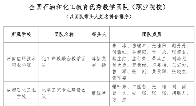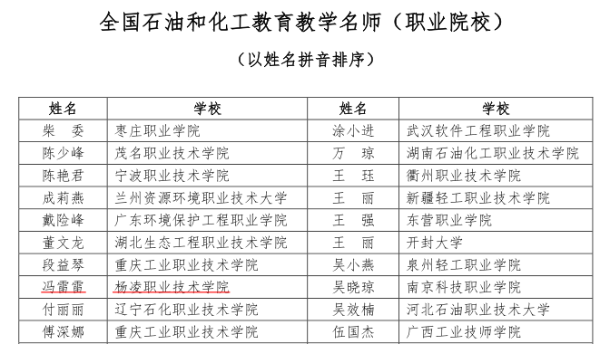 近日,中国化工教育协会公布了2023年全国石油和化工教育教学名师、优秀教学团队、优秀教学管理人员评选结果,浦京周博教授带领的药品生产技术教学团队荣获“全国石油和化工教育优秀教学团队(职业院校)”称号,冯雷雷副教授荣获“全国石油和化工教育教学名师”称号。