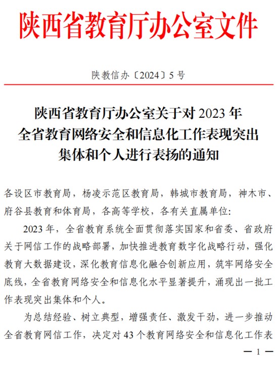 2月27日,陕西省教育厅发布了关于对2023年全省教育网络安全和信息化工作表现突出集体和个人表扬的通知,学校荣获全省教育网络安全和信息化工作表现突出集体,信息化建设与管理处朱鹂老师荣获全省教育网络安全和信息化工作表现突出个人。