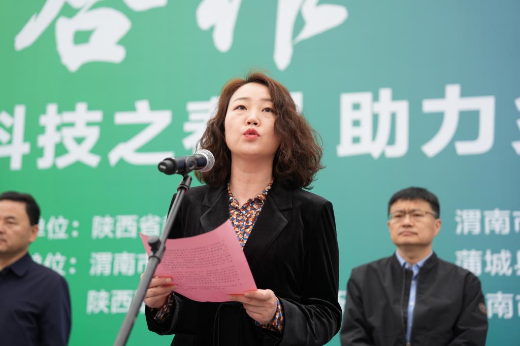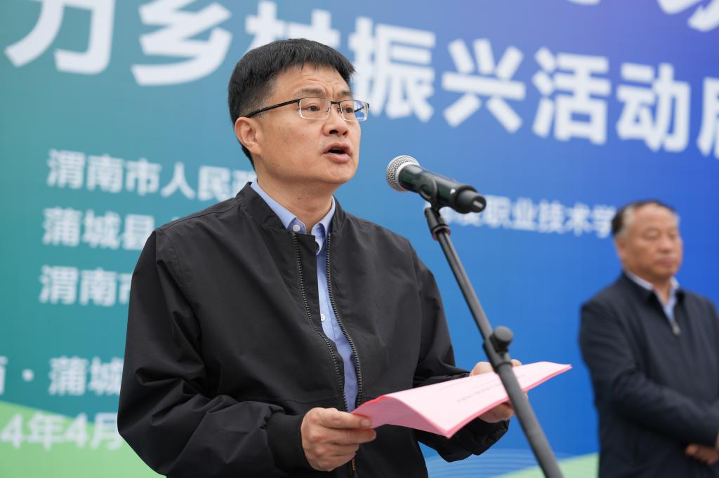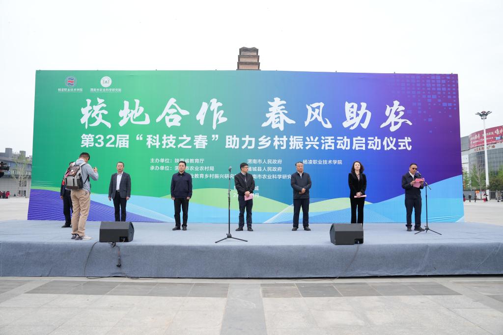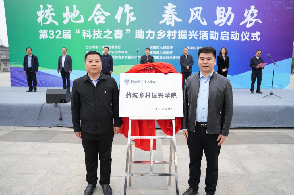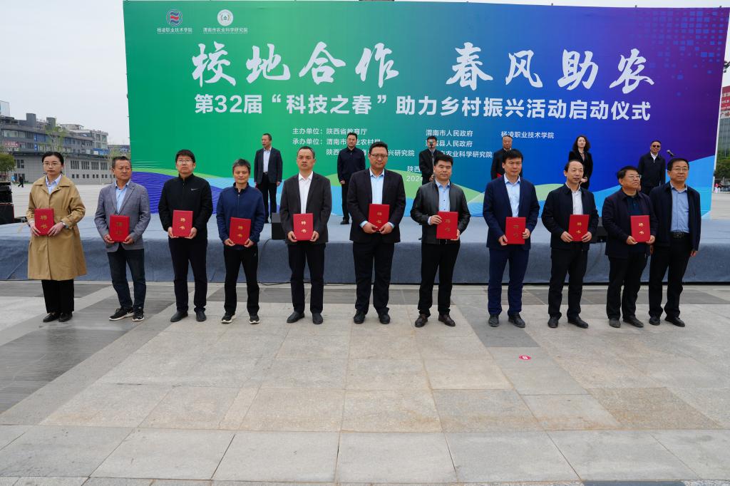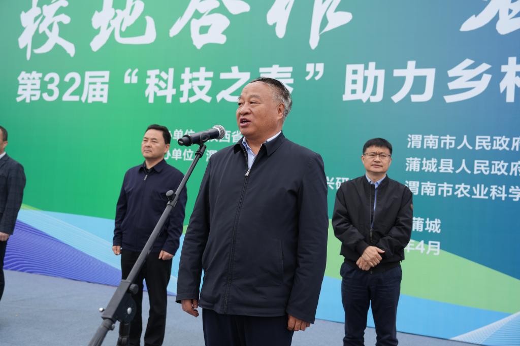 4月10日,由陕西省教育厅、渭南市委市政府和杨凌职业技术学院主办的第32届“科技之春”助力乡村振兴活动启动仪式在渭南市蒲城县中心广场举行。350vip浦京集团官网党委书记王周锁宣布第32届“科技之春”助力乡村振兴活动启动。省教育厅高校技术转移中心主任田鹏,渭南市农业农村局党委委员、副局长刘刚、党组成员、副局长普布顿珠,渭南市农科院院长王杨军,350vip浦京集团官网副校长胡俊鹏,蒲城县副县长冯新等出席启动仪式。