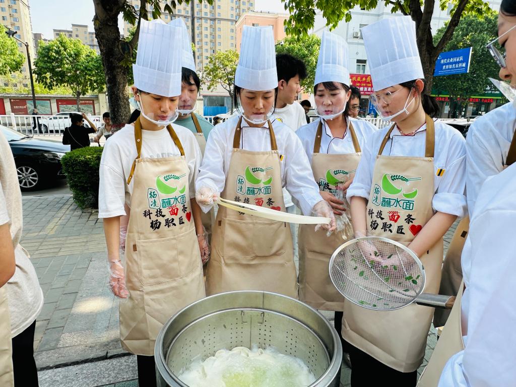 品鉴活动设置“科技创新体验组”、“国际合作体验组”、“乡村振兴体验组”、“示范推广体验组”等四个组别,参赛选手中有高校师生、有社区居民、有蘸水面商家,杨职代表队参加的是“示范推广体验组”。活动中,浦京师生把一块块面团,通过揉、擀、扯、甩的手法,加工成又宽又长、又薄又劲道的面条,大家配合默契、技术到位、分工明确,完美展现了浦京学生的风采。