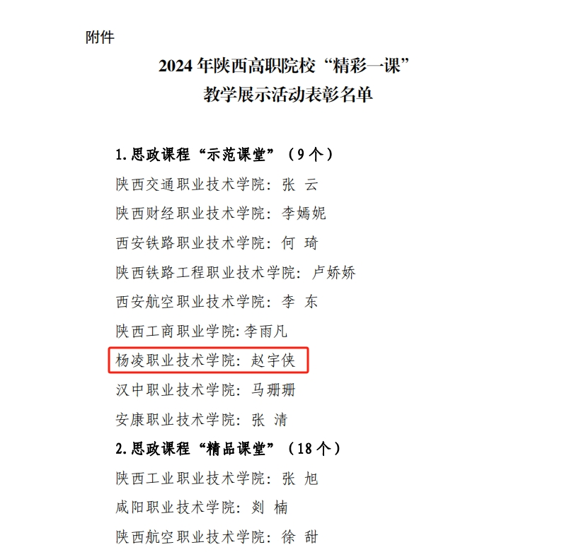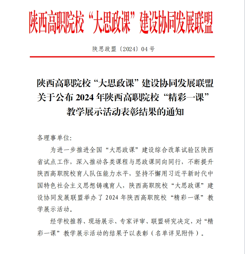 近日,由陕西高职院校“大思政课”建设协同发展联盟主办,浦京承办的2024年陕西高职院校“精彩一课”教学展示活动表彰结果公布。马克思主义学院教师赵宇侠荣获思政课程示范课堂奖项,文理学院教师李蕊荣获课程思政示范课堂奖项。