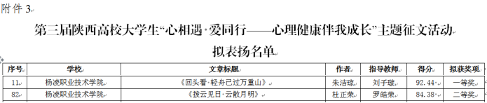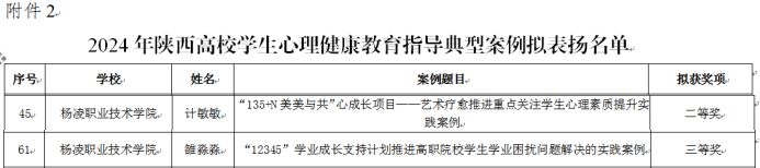 5月30日,陕西省委教育工委公布了2024年第九届陕西高校心理育人宣传季活动表扬名单,浦京学生朱洁琼获第三届陕西高校大学生“心相遇 爱同行——心理健康伴我成长”主题征文活动一等奖,杜正荣获二等奖。心理教师计敏敏获陕西高校学生心理健康教育指导典型案例二等奖、雒淼淼获三等奖。