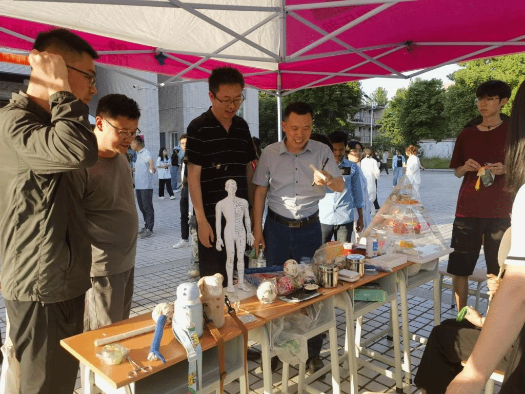 在送福安康展区,药物与化工学院学生现场展示山楂丸的制作过程,并讲解此次中草药香包制作的中药材及香包的不同功效,向大家科普了中药养生健康知识;专业教师现场演示拔罐、推拿、针灸、艾灸、刮痧、穴位按摩等教学实践环节,为现场师生带来专业的健康理疗体验。