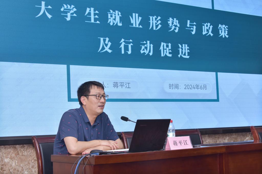 开班仪式上,蒋平江作动员讲话,他指出,“中央专项彩票公益金宏志助航计划”是教育部组织实施的高校毕业生就业能力培训项目,希望全体参训学员珍惜学习机会,充分认识本次培训的目的和意义,切实增强就业的责任感与紧迫感,积极把当前的就业培训内容和自己的求职就业统一起来,进一步提高就业认知,强化就业心理,提升就业能力。随后,蒋平江为毕业生作了“宏志助航计划”专题报告会。他深入剖析了当前的就业形势与政策,鼓励学生们树立正确的就业观,不断提升自己的综合素质和竞争力,从自身的兴趣和能力进行选择,才能在激烈的竞争中脱颖而出。