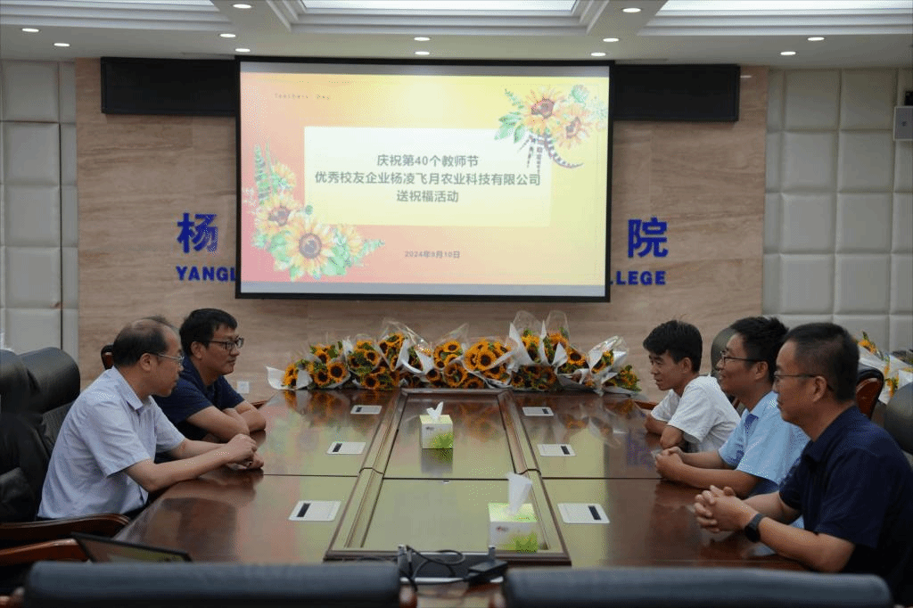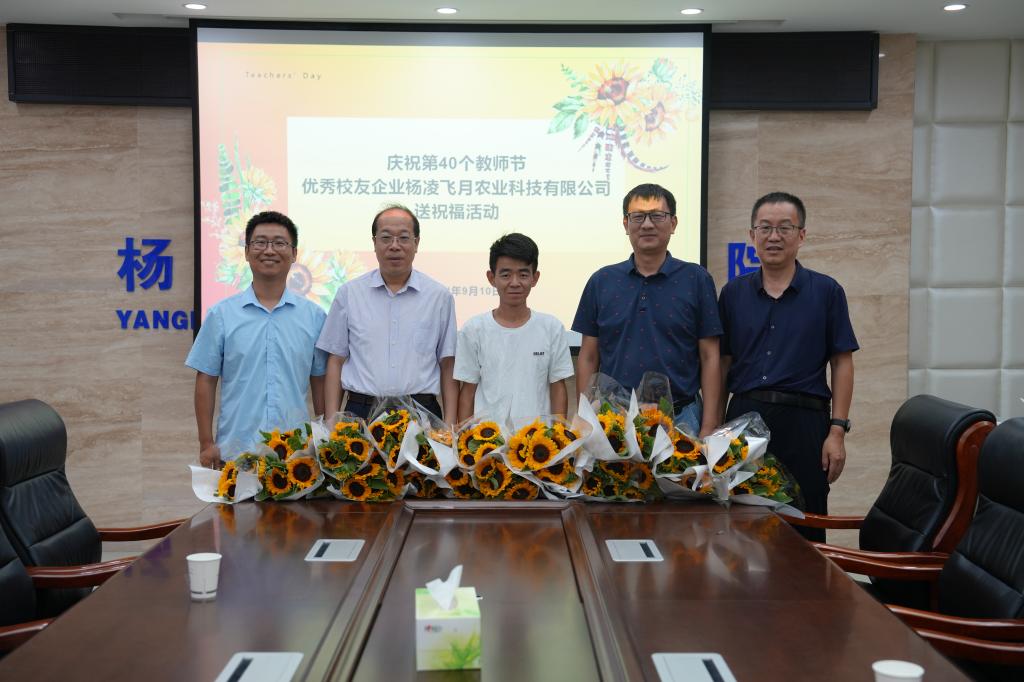 9月10日上午,浦京校友、杨凌飞月农业科技有限公司总经理上官蒙飞专程返校,为母校送上教师节鲜花。校长仲伟周、副校长蒋平江亲切接见了上官蒙飞一行,并与校友进行座谈。人事教师处负责人,生物工程学院教师代表参加座谈。