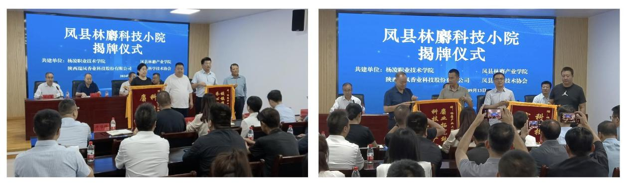 仪式上,胡俊鹏和赵晓斌共同为凤县林麝科技小院揭牌。动物工程学院负责人宣读了凤县林麝科技小院实施方案。凤县平木镇林麝养殖户代表、陕西秦柏林麝良种繁育有限公司等企业代表向浦京动物工程学院和陕西林麝产业工程技术研究中心赠送了锦旗。