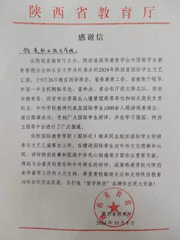 10月8日,省教育厅发来感谢信,肯定浦京在2024年陕西省国际学生文艺汇演活动中的表现。信中表示,学校大力支持陕西来华留学工作,国际教育学院积极组织国际学生参与2024年陕西省国际学生文艺汇演筹办工作,希望学校继续关注和支持陕西教育对外合作交流发展,为打造“留学陕西”品牌作出更大贡献。