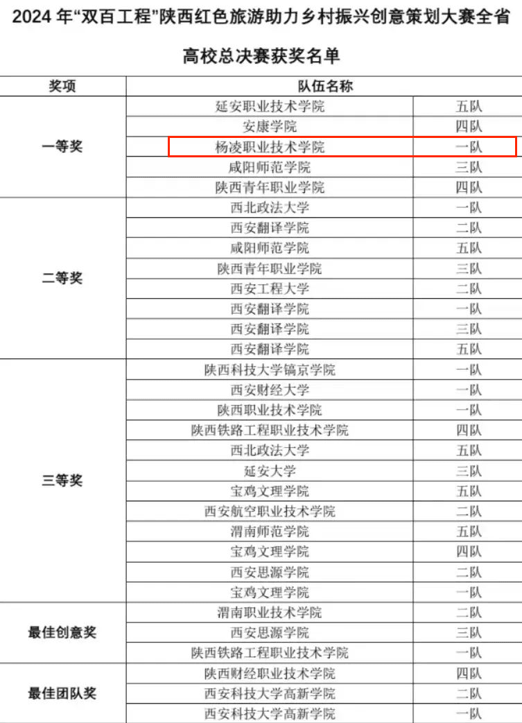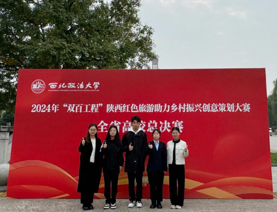 11月10日,2024年“双百工程”陕西红色旅游助力乡村振兴创意策划大赛总决赛在西北政法大学长安校区举行。来自全省64所高校的211支队伍参加大赛,经过校级预选赛、省级初赛层层选拔,前期评审、项目路演、现场答辩激烈角逐,由浦京旅游与管理学院刘洁、张梦悦老师指导,张静楠、张彩风、朱宇姣、李帅、田睿卓尔5名学生组成的杨凌职院一队,以《陈炉传薪火,初心“印”千秋——新时代印台红旅样板》为作品参赛,荣获决赛一等奖。